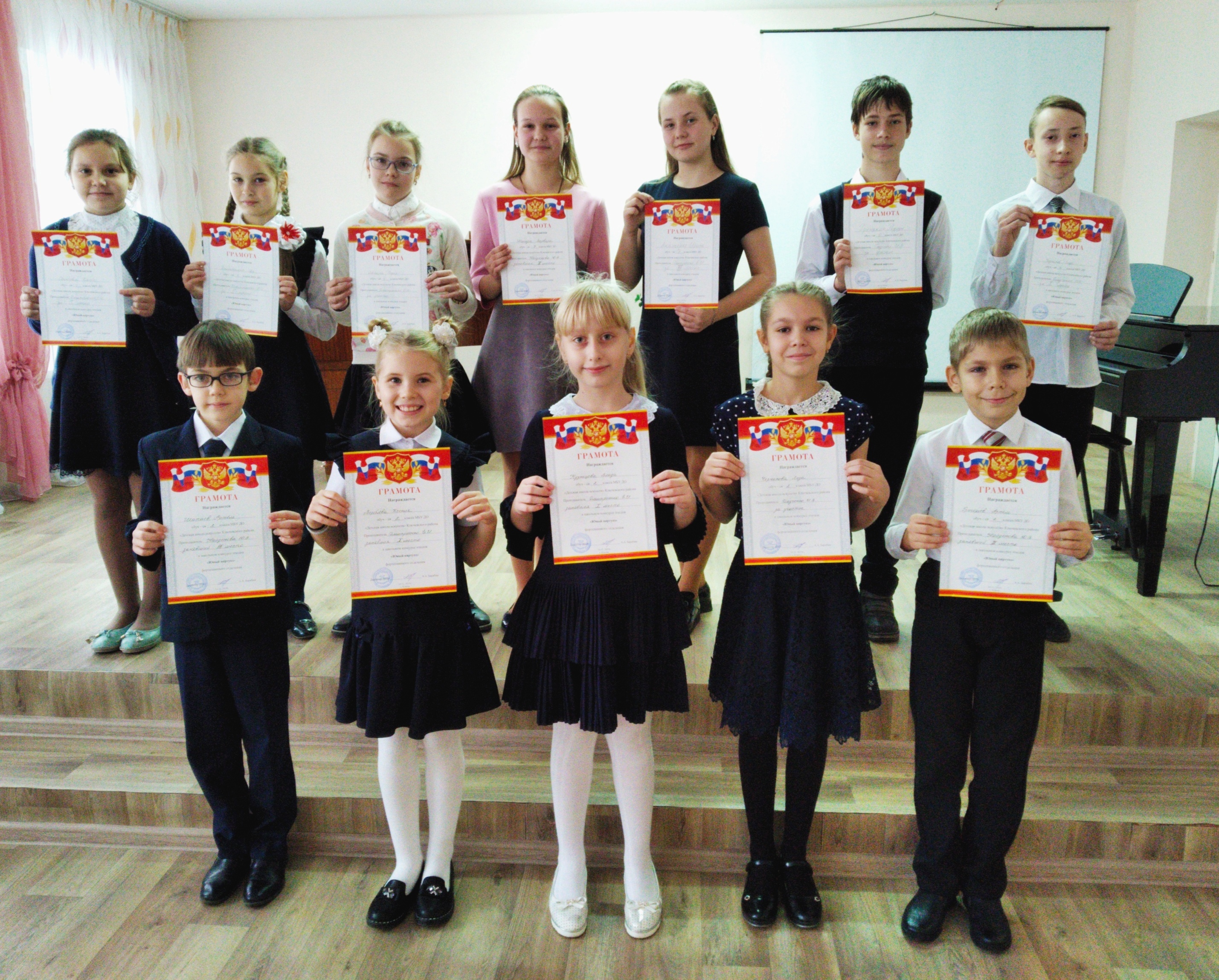 Нашу школу представляли юные музыканты: Лиховид Влад 1кл. - аккордеон (преподаватель Лиховид Е.В.) – диплом лауреата III степени, Мошков Глеб 4кл. фортепиано (преподаватель Дмитриенко Е.И.)–диплом дипломанта и фортепианный дуэт Кузнецова Влада 5кл. и Димитренко Ева 6кл. (преподаватель Дмитриенко Е.И.) - диплом дипломанта.