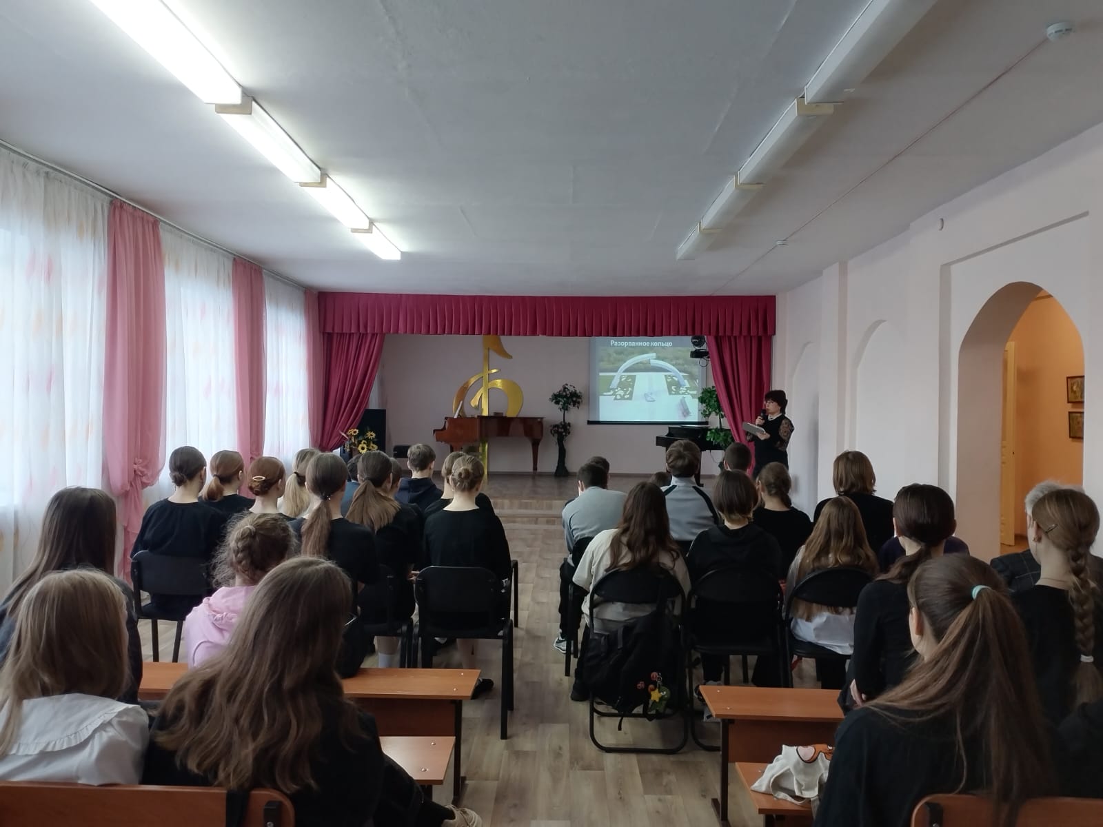 Присутствующие в зале обучающиеся старших классов, преподаватели с большим интересом смотрели презентацию и слушали беседу, которые подготовили преподаватели фортепианного отделения ДШИ, вступали в дискуссии, вместе рассуждали, что-то вспоминали, о чем-то узнавали впервые. Основой тематического часа звучал главный вопрос «Когда пушки говорят, музы молчат?», явившийся строкой из поэмы Льва Болеславского «Шостакович». Какая музыка звучала во время войны, и как она помогала всему советскому народу идти в Великой Победе? Главными темами этого внеклассного мероприятия стали истории возникновения песен, написанных именно во время Великой Отечественной войны, а так же история блокады Ленинграда, увековеченная всеми последующими поколениями, где была создана Дмитрием Шостаковичем знаменитая «Симфония №7» («Ленинградская») и исполнена симфоническим оркестром Ленинградской филармонии в период блокады. Ребята прикоснулись к происходившим историческим событиям в военные годы через знакомство с музыкой военных лет, осознавая ее огромное значение в те тяжелые годы и актуальность в наше время.